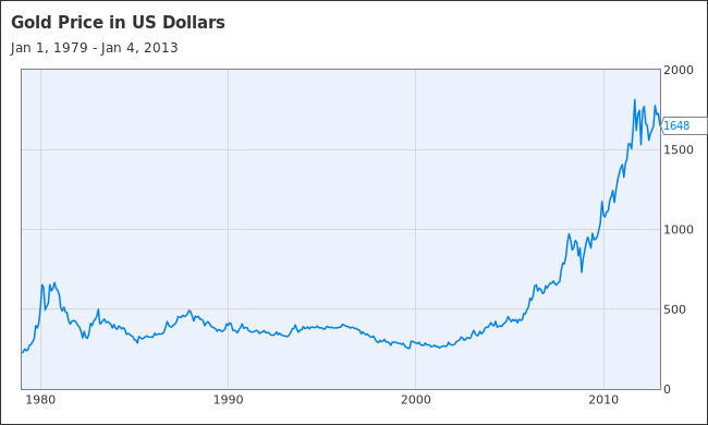 The above graph shows the price of gold against the US dollar. The gold price rose to above 500 dollars in the beginning of the 1980s because of the high inflation, geopolitical instability and the 1979 oil crisis, then the price dropped and didn’t recover to the same levels until the great financial crisis of 2008.
